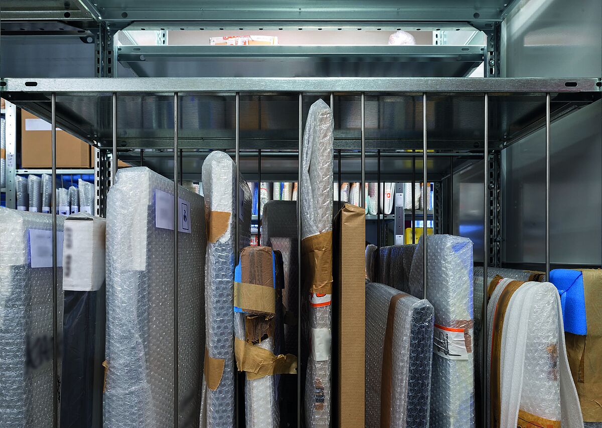 Las estanterías de paletas, amplias o de compartimentos son el sistema de almacenamiento ideal para una gran cantidad de objetos de museo y arte. Especialmente los objetos pesados, poco manejables y voluminosos encuentran espacio en estas soluciones de almacenamiento rentables.