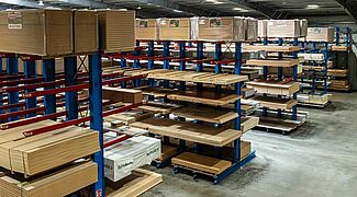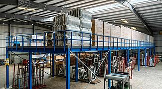 De este modo, el aprovechamiento del espacio en la nave de FRIES ha llegado realmente a un nuevo nivel: hasta entonces, en la nave solo se trabajaba en el suelo, sin aprovechar la altura de la misma. La entreplanta permitió crear un área de trabajo adicional sin necesidad de construir una nave nueva. El espacio de almacenamiento ganado en la superficie de la nave se aprovecha de la forma más eficiente posible mediante el almacenamiento en bloques. Cabe destacar que la antigua estantería cantiléver sigue utilizándose: ahora se almacenan aquí mercancías a las que se debe acceder por separado y que, por lo tanto, no son aptas para el almacenamiento en bloque.